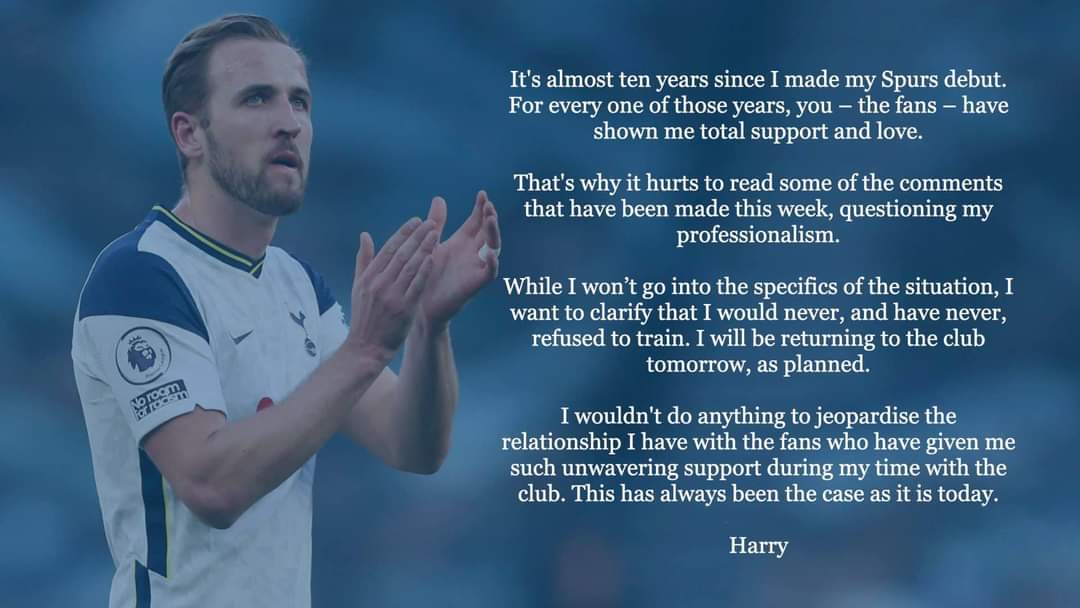 해리 케인이 훈련 불참 논란에 대한 입장문을 발표했다.