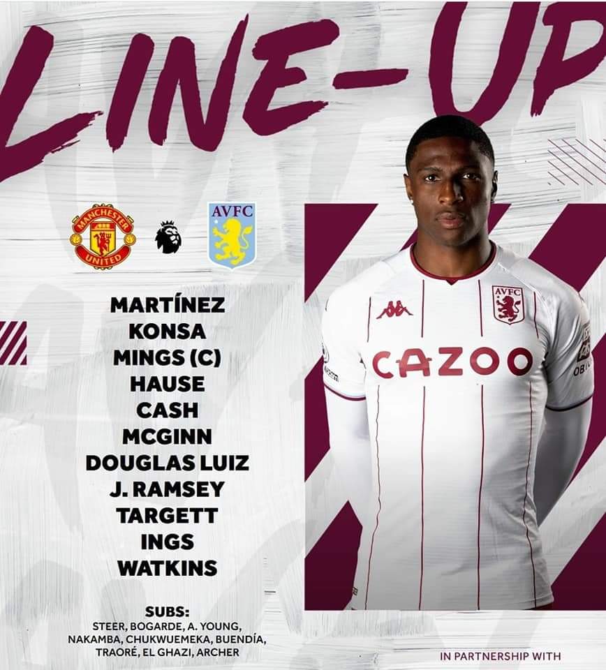 빌라는 왓킨스와 새롭게 영입한 대니 잉스를 투톱으로 배치해 맨유의 골문을 노렸다. 그리고 튀앙제브는 임대로 빌라에 합류했기 때문에 원 소속팀 상대로 뛸 수 없는 조항으로 나오지 못했고 대신해서 코트니 하우스가 선발 명단에 이름을 올렸다.