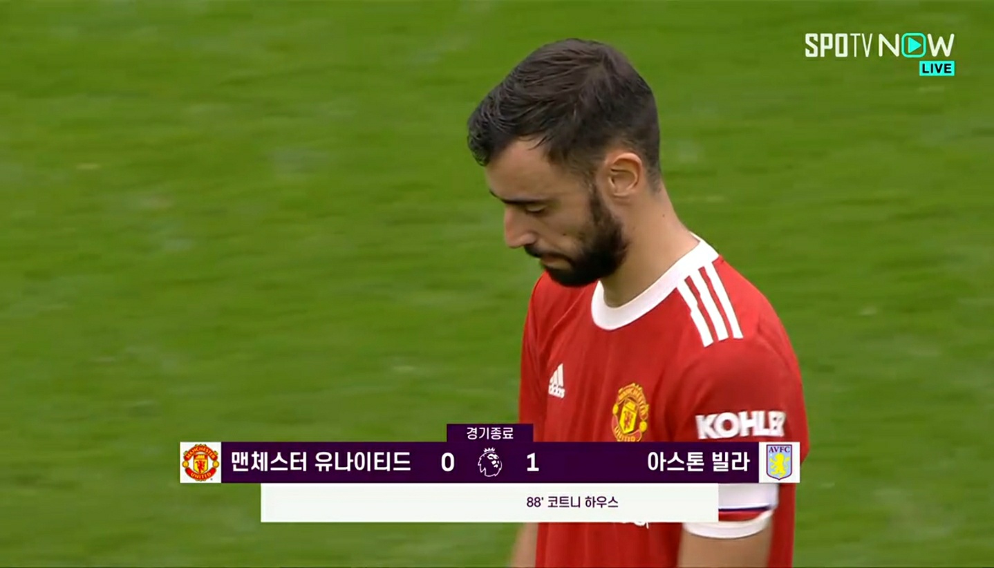 그리고 얼마 지나지 않아 후반 91분, 선제골을 넣었던 코트니 하우스가 박스 안에서 수비 도중 손으로 볼을 막았고 맨유가 PK를 얻어냈다. 그리고 호날두가 아닌 브루노 페르난데스가 PK를 준비했지만 PK를 얻어낸 기쁨도 잠시 브루노 페르난데스가 PK를 실축하였고 승리의 여신은 아스톤 빌라의 손을 들어주었다.